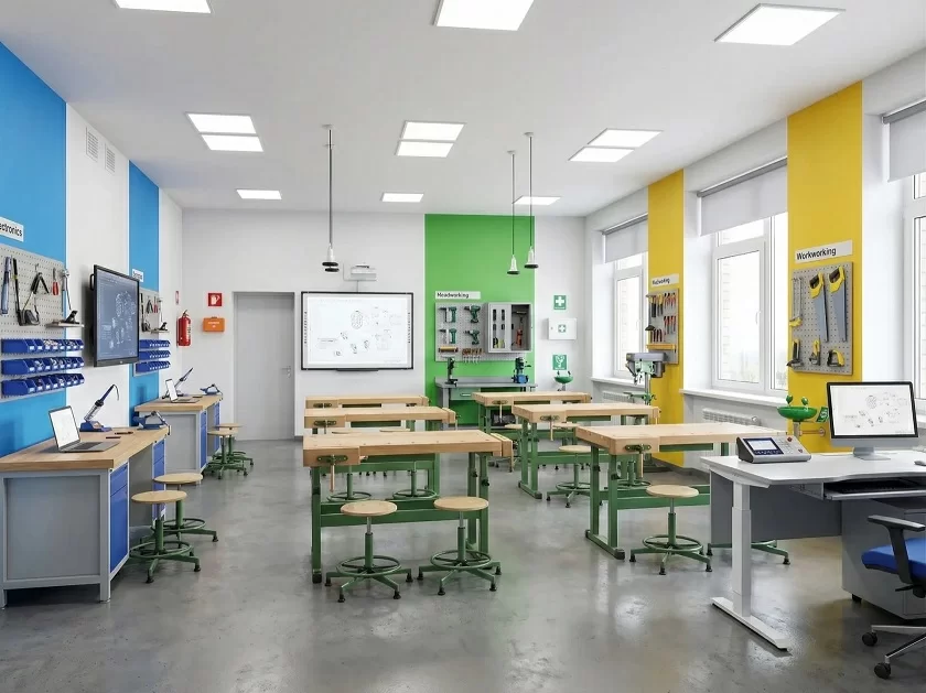 В обновлённом кабинете планируют создать несколько функциональных зон для разных модулей обучения: работа с беспилотными летательными аппаратами (БПЛА, робототехника, швейное и слесарное дело.