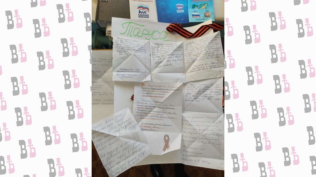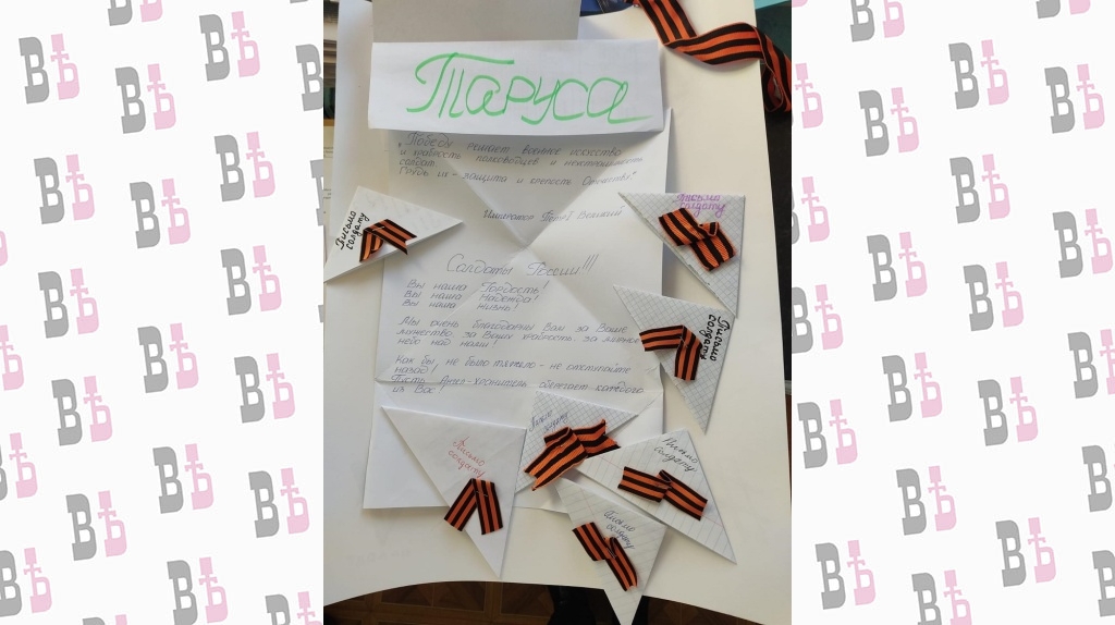 Тарусяне разных возрастов откликнулись на акцию «Напиши письмо солдату», организованную всероссийской партией «Единая Россия». Незнакомым героям современности отправляют целые плакаты, украшенные георгиевскими лентами.
