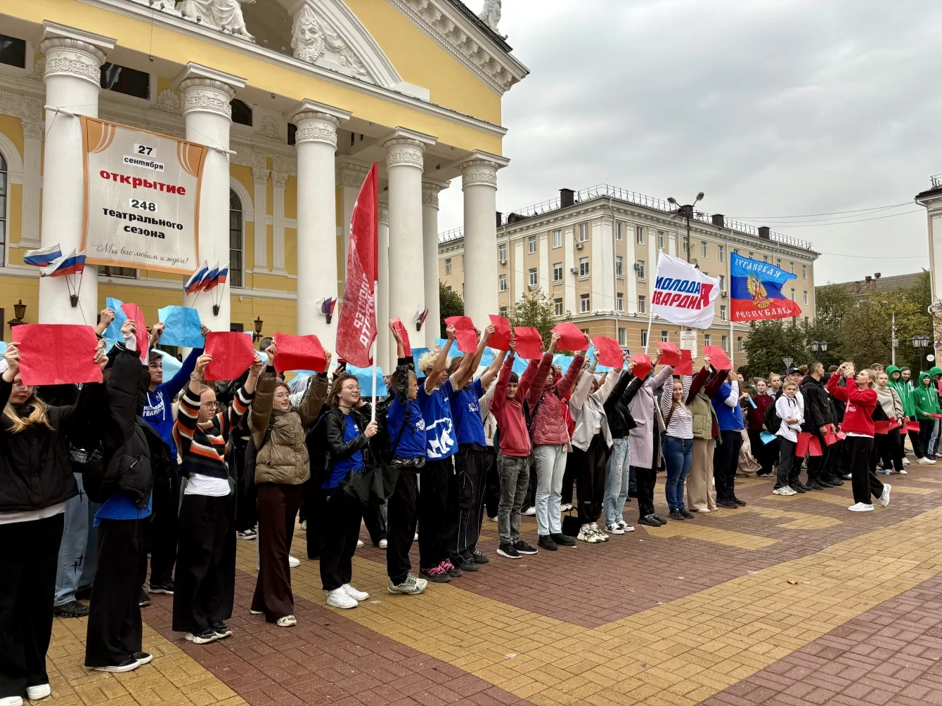 Праздничные события стартовали уже в пятницу, 27 сентября. Калужские региональные отделения «Молодой Гвардии Единой России» и «Волонтерской Роты Боевого Братства» провели флешмоб на Театральной площади Калуги, напомнив калужанам, как выглядят государственные символы новых республик.