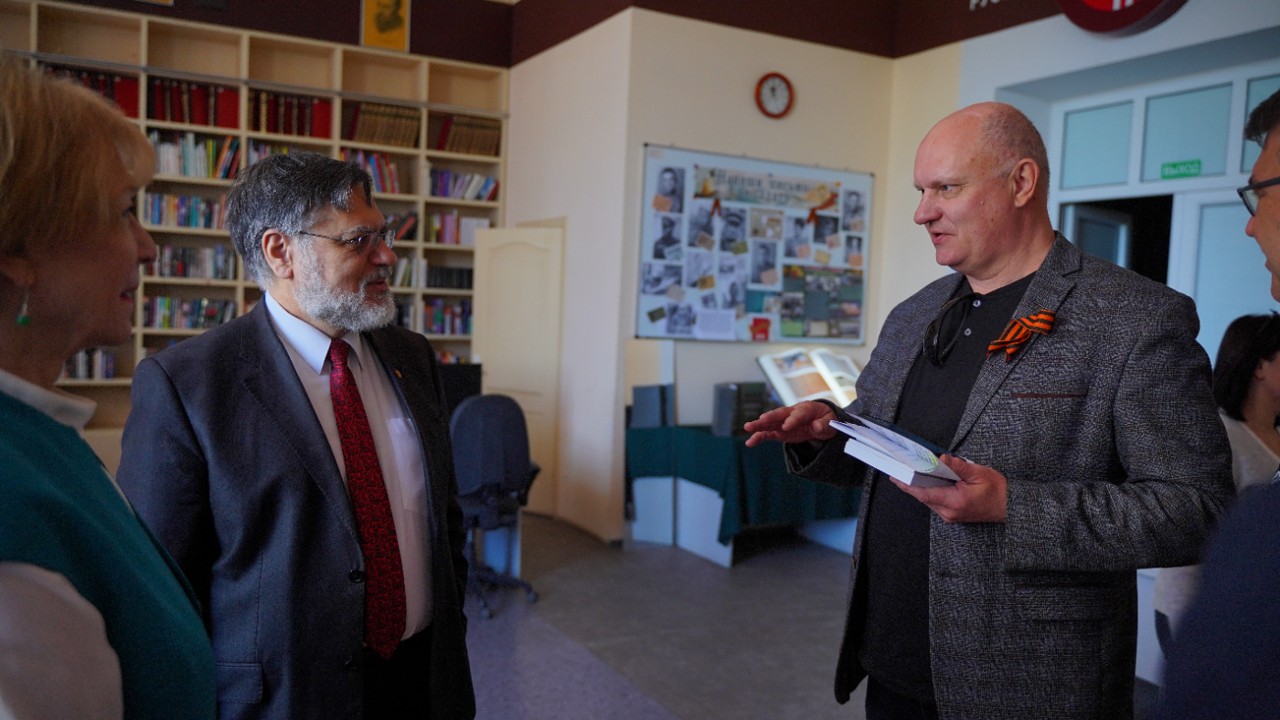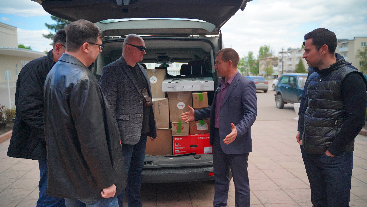 Сергей Александрович встретил нас в своем кабинете по-дружески тепло, но в ходе беседы был серьезен, озабочен. Оно и понятно. Перед самым нашим приездом первомайцы слышали два близких взрыва, и их причина пока была не ясна. (Забегая вперед: вечером того же дня, вскоре после того, как мы покинули подшефный город, в жилую застройку прилетел украинский дрон. К счастью, обошлось без жертв.) Лицо мэра озарилось улыбкой лишь в финале, в момент передачи привезенной нами гуманитарной помощи, предназначенной для детской школы искусств и Музея истории города.
