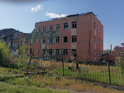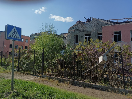 В этот день мы еще попросили калужских кураторов подшефного города показать нам Горское – близлежащий населенный пункт, освобожденный, как и Золотое, в июне 2022 года и тоже вошедший в состав Первомайского городского округа. Фото, представленные здесь, я снял камерой мобильного телефона из окна автомобиля на одной из улиц этого шахтерского городка. Думаю, в комментариях они не нуждаются. Здесь мы сделали лишь одну остановку у школы, в которую прилетели две ракеты американской системы залпового огня «Хаймерс».