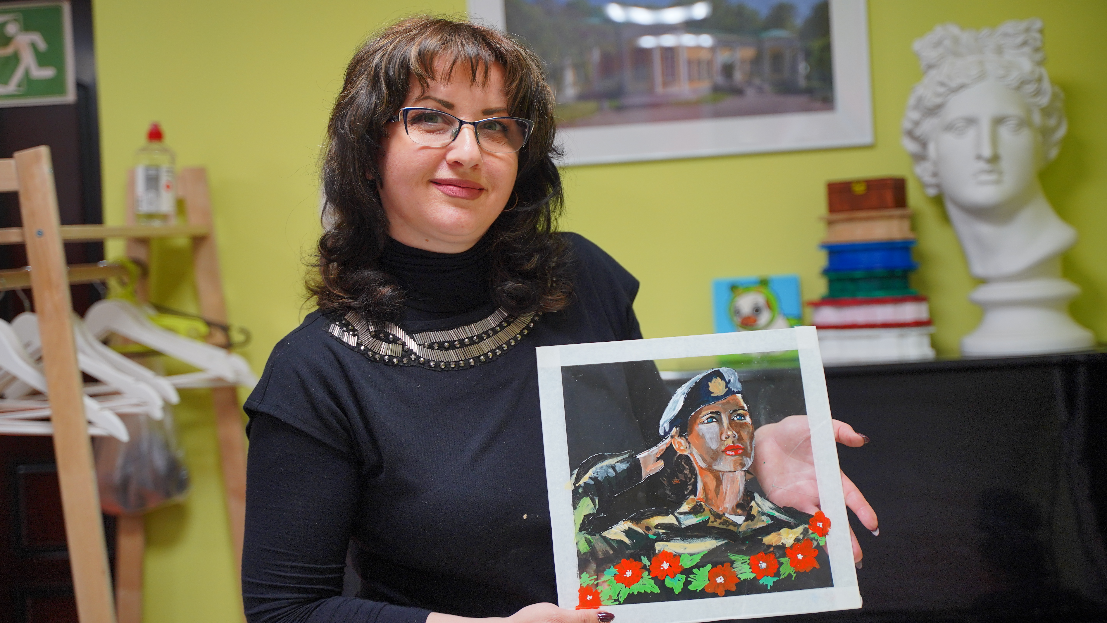 После презентации мы заехали в Музей истории города Первомайска. Там, кстати, только-только завершилось мероприятие с калужским участием: сотрудники нашего Музея истории космонавтики развернули передвижную выставку. С прошлого года здесь действует детский центр. Для его творческой мастерской и предназначалась часть привезенных нами подарков. Руководитель центра Марина Матвейчук показывает детские работы – картины на стекле: большинство – на военную тему. Вот солдат прощается с любимой, а вот серия портретов девушек в армейской форме.