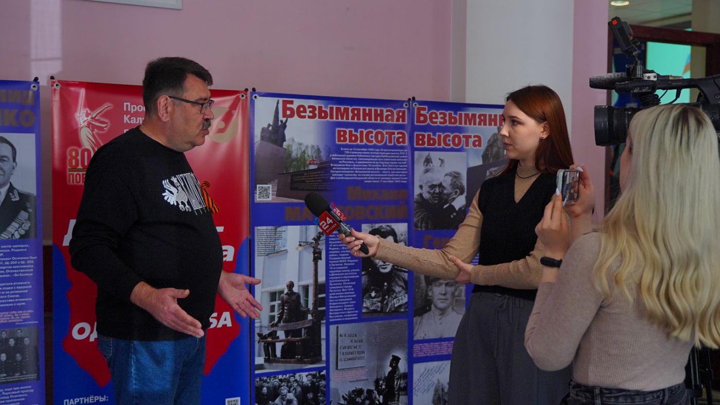 Презентация нашего проекта проходила в детской школе искусств, которая расположена на городской площади прямо напротив местной администрации. В фойе развернули выставку: баннеры на стойках-«пауках» с информацией о героях. В просторном зрительном зале с новыми креслами состоялся показ документального фильма, снятого коллегами из ГТРК Калуга. Посмотреть его пришли старшеклассники и учащиеся местного колледжа, человек 30. Собираться на мероприятиях большими группами запрещено правилами безопасности – до «ленточки» отсюда всего полсотни километров.Знаете, юные первомайцы меня удивили. Когда шел фильм, никто не шумел, не играл в телефончике – их внимание было, без преувеличения, приковано к экрану. А после показа ребята рассудительно, вовсе не штампами и не высокопарными заезженными словами отвечали на вопросы журналистов. Нет, не подумайте, что я хочу как-то укорить их калужских сверстников – и у нас, наконец-то, растет в массе своей не безнадежное поколение. Но что-то подсказывает, что такое поведение донбасских подростков не случайно. Они знают о войне не понаслышке. Война им ближе во всех смыслах. И та, что уже 80 лет, как закончилась, получается, тоже.