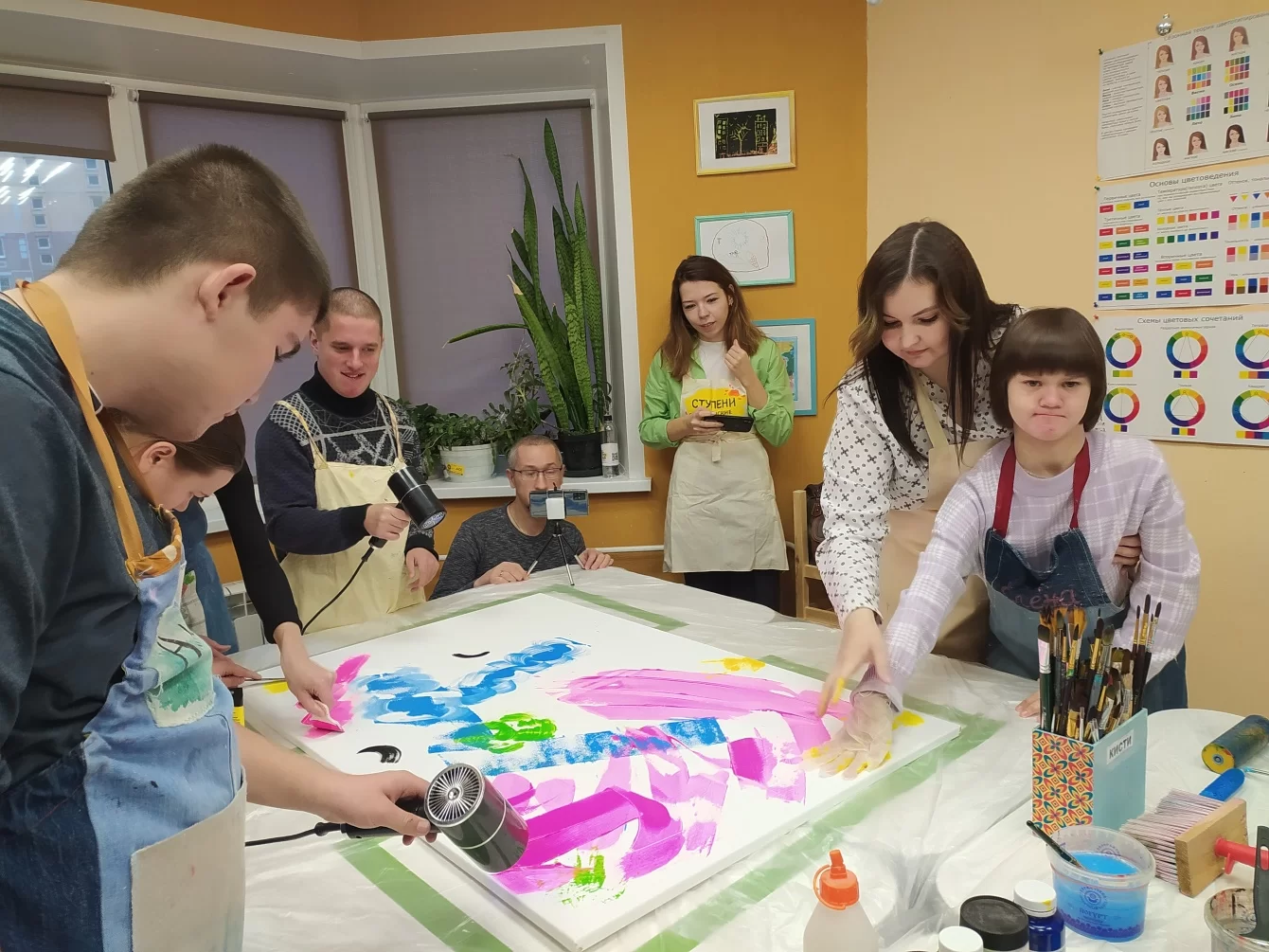 Знакомство получилось не только теоретическим, но и практическим: всем гостям и родителям предложили присоединиться к занятиям и попробовать себя в разных мастерских наравне с воспитанниками: отразить эмоции в картине, почувствовать себя дизайнером и изготовителем значков, совместно исполнить песню, подыгрывая себе на разных инструментах.