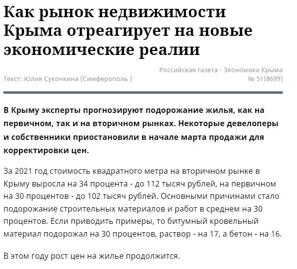 Фейк был одновременно вброшен в украинские СМИ и соцсети и активно продвигается. На самом деле цены на квартиры растут и растут существенно. В перспективе российские курорты будут еще более востребованы. Крымские застройщики готовятся выводить на рынок совсем небольшие квартиры в 12-20 квадратных метров по цене в 3-4 млн рублей — эти цены сравнимы с московскими.
