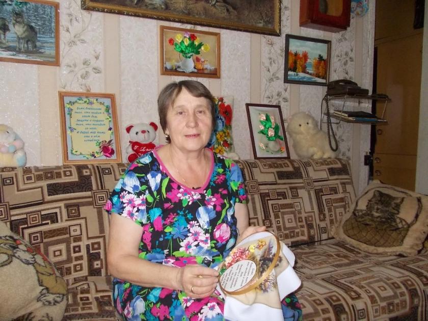 В свободное время занимается рукоделием. Раньше мастерица вязала варежки, носки, свитера, пуловеры. Теперь в этом нет особой нужды и можно попробовать свои силы и умения в другой области – вышивании. И не только традиционном вышивании крестиком, но и бисером. «Домик в деревне», выполненный бисером, был подарком к юбилею супруга. Переливы бусинок и умело подобранные оттенки переносят нас в заснеженную деревню, где холодным голубым сиянием горят ели, плотным кольцом окружившие заметенный снегом домик, стоящий на окраине. В небольшой речке, закованной льдом, будто в зеркале, отражаются розовые с бирюзой облака заката. Кажется, стоит внимательнее вслушаться и можно услышать тихий шорох соскальзывающего с еловых лап снега.
