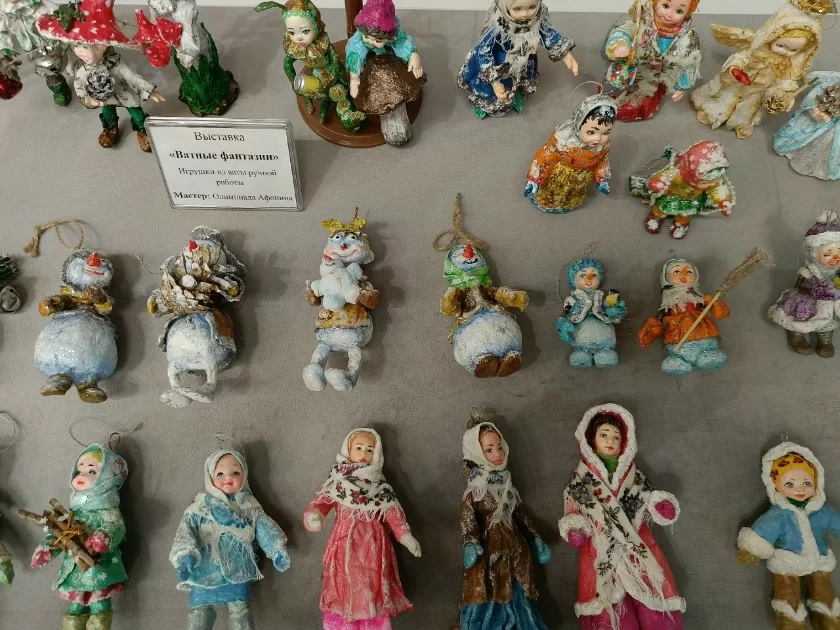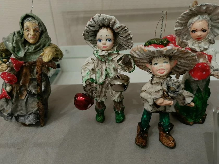 В экспозиции представлены более 50 игрушек. Среди них сказочные персонажи, снеговики, куклы, задумчивые мальчики в мягких пальтишках и в пушистых шапках, закутанные шалями девочки, смешные грибочки и другие.