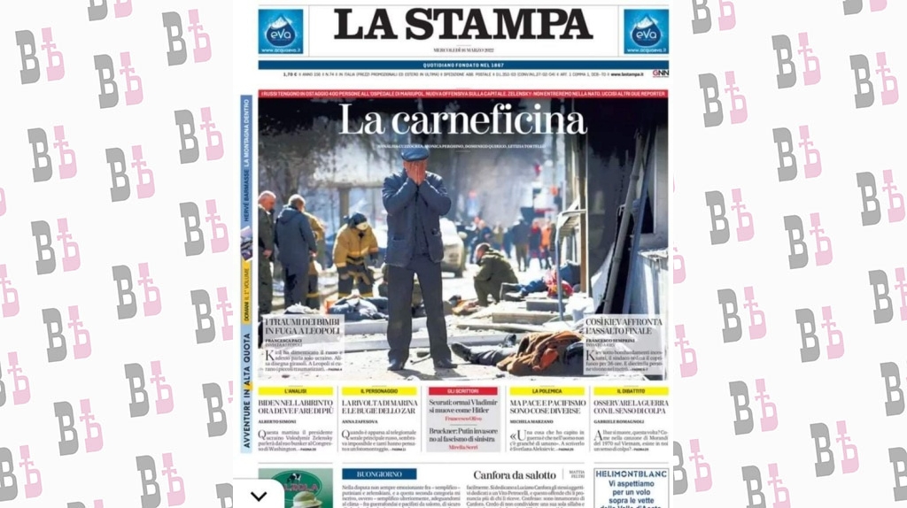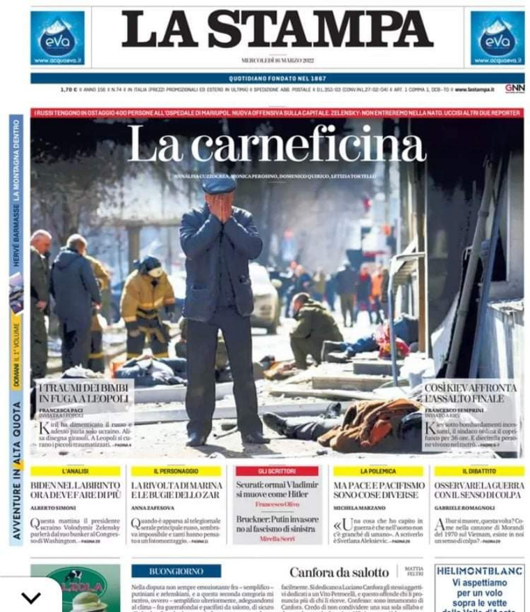 La Stampa разместила фото на первой полосе, сообщив о «бойне в Киеве», которую якобы устроила российская армия. На самом деле на снимке Эдуарда Корниенко от 14 марта можно увидеть последствия взрыва украинской ракеты «Точка-У» в центре Донецка: посреди улицы на фоне трупов стоит мужчина и закрывает лицо руками.