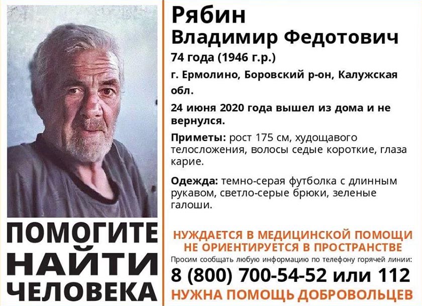 Как сообщает поисковый отряд «Лиза Алерт», 24 июня в Ермолине Боровского района пропал Владимир Федотович Рябин, 74 года.