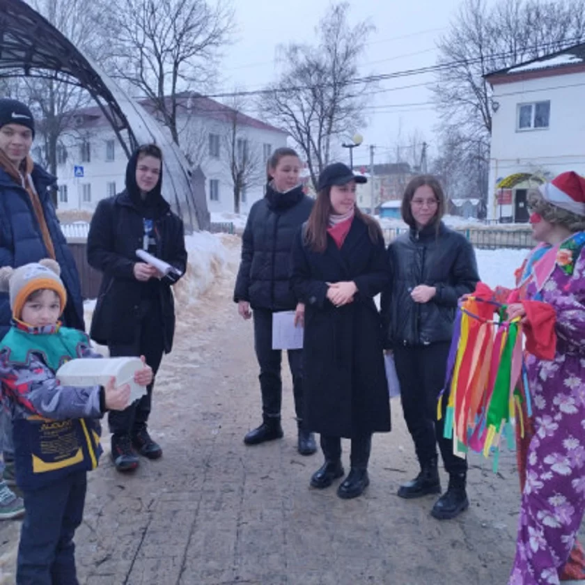 Скоморохи в ярких костюмах провели для горожан веселую масленичную викторину. За правильные ответы маленький медвежонок раздавал сладкие призы. С помощью «волшебного» колеса, скоморохи предсказывали судьбу на предстоящий год.