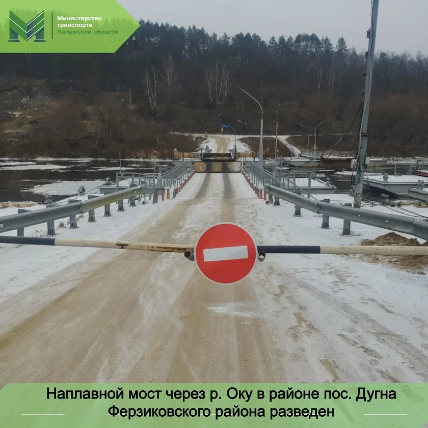 Мост через реку Оку в районе поселка Дугна развели для пропуска ледяной шуги. В министерстве отметили, что информация о возобновлении движения будет дополнительно опубликована позже. Водителям рекомендуется заблаговременно выбирать альтернативные маршруты.