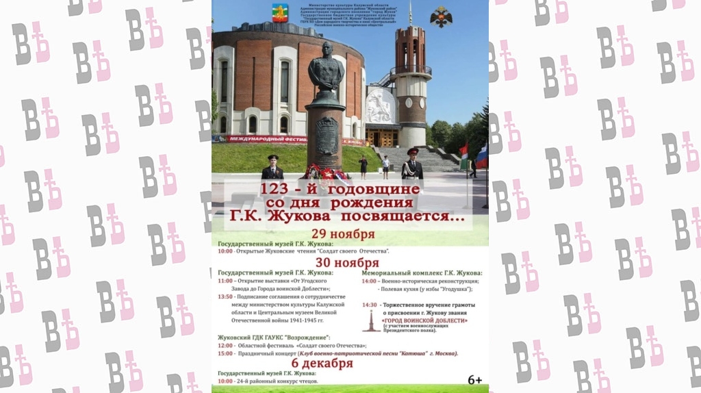 29 ноября состоятся открытые чтения "Солдат своего Отечества". 30 ноября планируется открытие выставки "От Угодского Завода до города воинской славы", подписание соглашения о сотрудничестве между министерством культуры Калужской области и Центральным музеем Великой Отечественной войны 1941 - 1945 гг. и торжественное вручение грамоты о присвоении Жукову звания "Город воинской доблести". Зрители смогут увидеть военно-историческую реконструкцию и попробовать кашу из полевой кухни. Также пройдут областной фестиваль "Солдат своего Отечества" и праздничный концерт.6 декабря состоится 24-й районный конкурс чтецов.