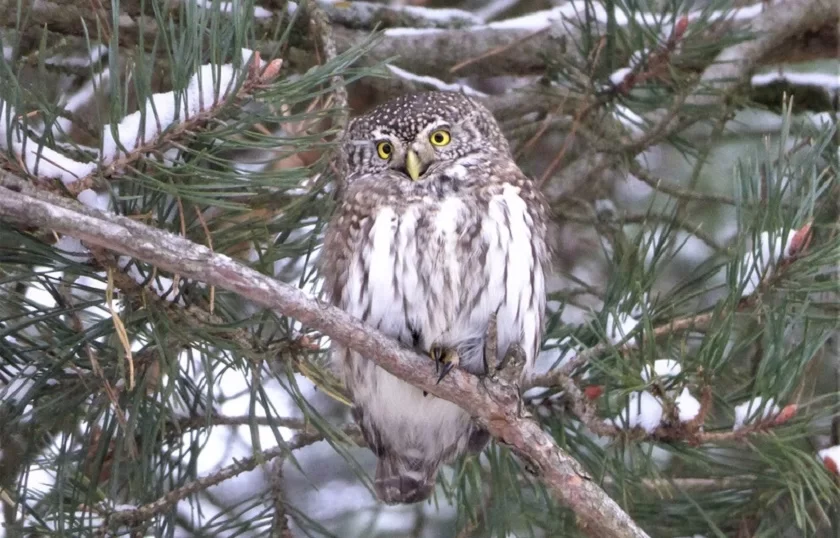Вчера, 20 ноября, Юрий Галчёнков заснял на фотокамеру самую маленькую сову Калужской области – воробьиного сычика, длина тела которого обычно достигает 19 сантиметров. В своем посте орнитолог пишет, что представители данного вида в осенне-зимний период активны не только по ночам, но и в дневное время суток.