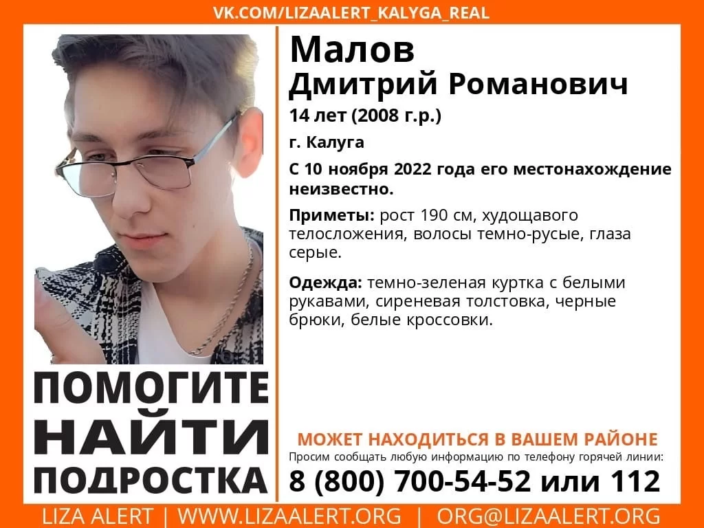 Всех калужан, которые видели Диму или знают о его местоположении, просят позвонить по телефону горячей линии отряда 8 800 700-54-52.