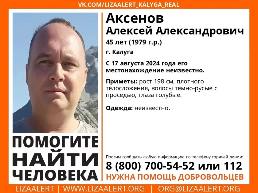 Пропавший ростом 198 сантиметров, с темно-русыми волосами с проседью и голубыми глазами. Одежда, в которую был одет калужанин в день пропажи, неизвестна.