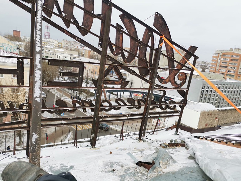 В областном центре сегодня демонтировали надпись-артефакт, которой теперь предстоит пройти реставрацию.
