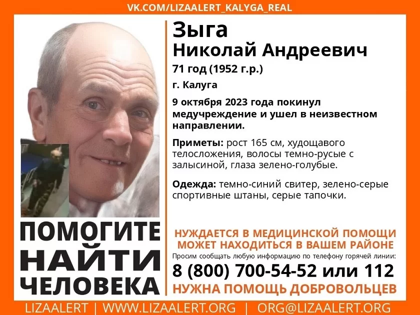 Николай Андреевич Зыга был одет в темно-синий свитер, серо-зеленые спортивные штаны и серые тапочки. Пропавший худощавый, ростом 165 сантиметров, с темно-русыми волосами с залысиной и зелено-голубыми глазами. Нуждается в медицинской помощи.