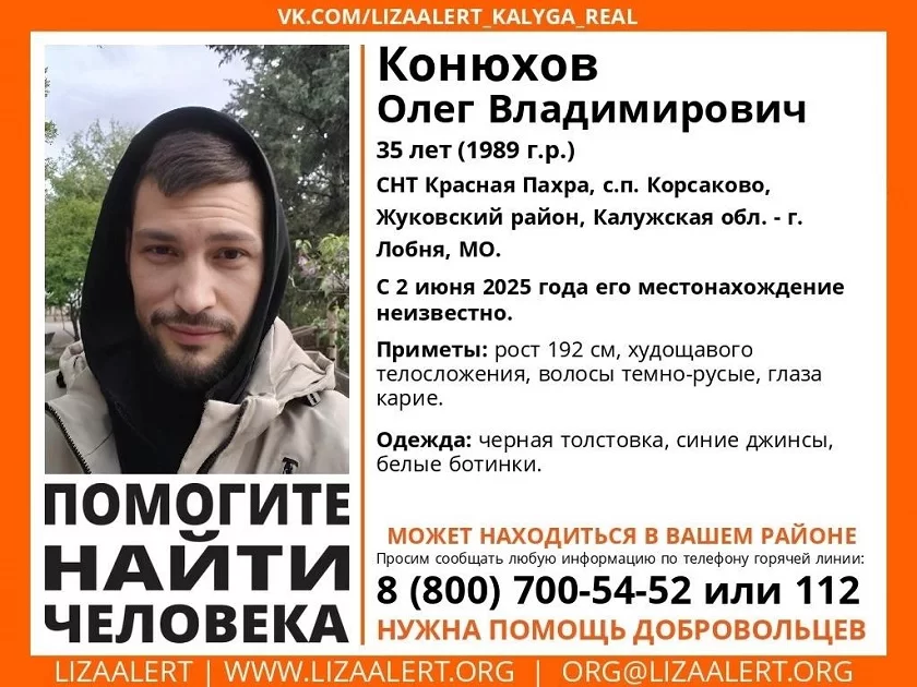 Волонтеры поискового отряда «ЛизаАлерт» разыскивают Олега Конюхова 1989 года рождения. Приметы: худощавый, рост 192 сантиметров, карие глаза и темно-русые волосы. Одет был в чёрную толстовку, синие джинсы и белые ботинки.