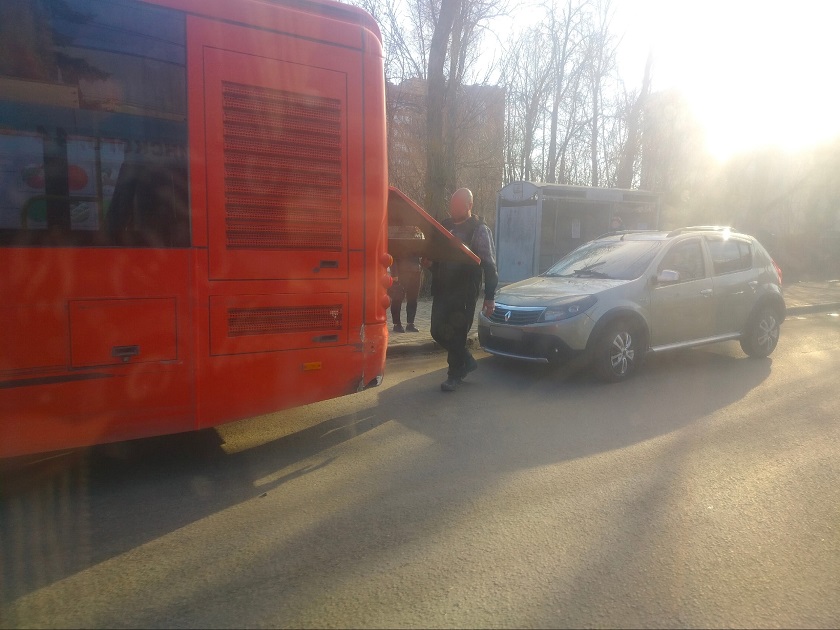 Около половины пятого возле остановки общественного транспорта автомобиль Renault Sandero въехал в автобус №34. У обоих транспортных средств видимых повреждений нет.