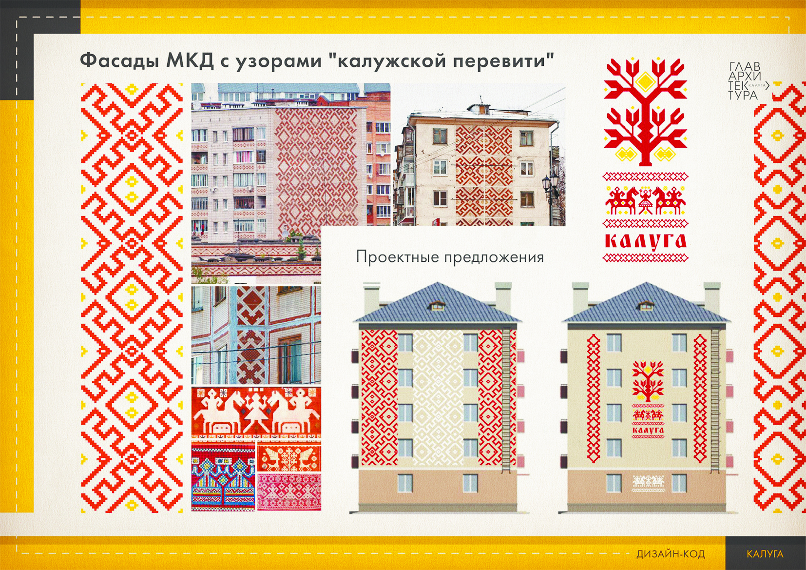 В рамках работы над дизайн-кодом для десяти центральных улиц уже продуман внешний вид фасада каждого здания. Для каждого типа городской застройки сектором главного архитектора также разработаны варианты колористических решений. В их основе цвета, традиционно используемые в Калуге. При этом Алексей Комов считает важным сохранить на многоэтажных домах «калужскую перевить» - традиционный орнамент, использовавшийся в городском массовом строительстве в 70-е годы прошлого века. Его образцы оцифровываются и заносятся в каталог, чтобы потом их можно было воспроизвести.