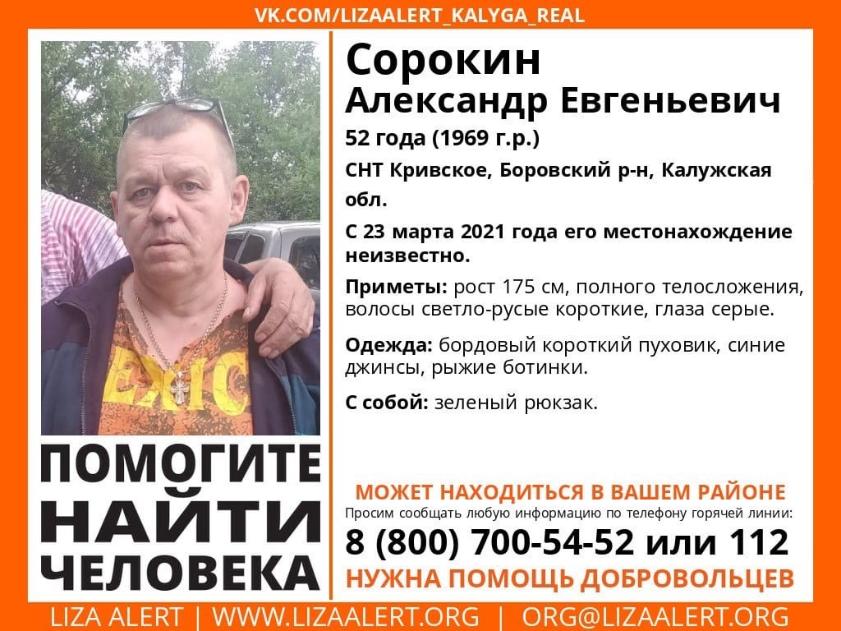В среду на странице калужского отделения поисково-спасательного отряда "Лиза Алерт" появилась информация о сборе добровольцев для поиска Александра Сорокина. Желающие принять участие в розыске соберутся в 17.30 у дома 47 по улице Березовая в садоводческом товариществе Кривское. Координаты: 55.141799, 36.521843.