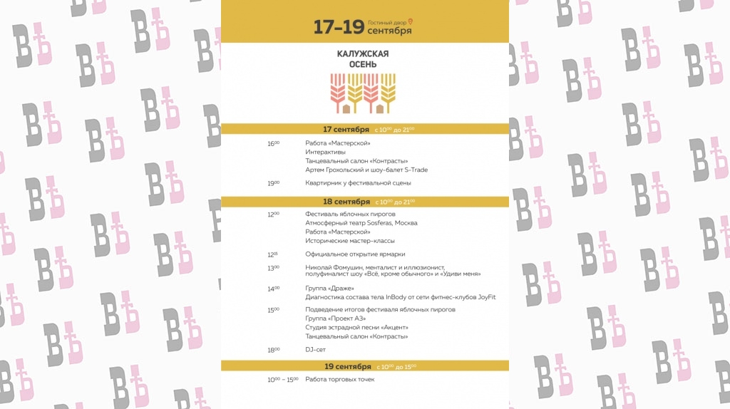 Основные мероприятия ярмарки пройдут в субботу, в полдень стартует фестиваль яблочных пирогов, в Гостином дворе выступит столичный атмосферный театр Sosfears, продолжится работа мастерской. Официальное открытие «Калужской осени» запланировано на 12.15 18 сентября. После открытия калужан ждут выступления иллюзиониста Николая Фомушина, группы "Драже", группы "Проект АЗ", студии эстрадной песни "Акцент", вечером состоится DJ-сет.