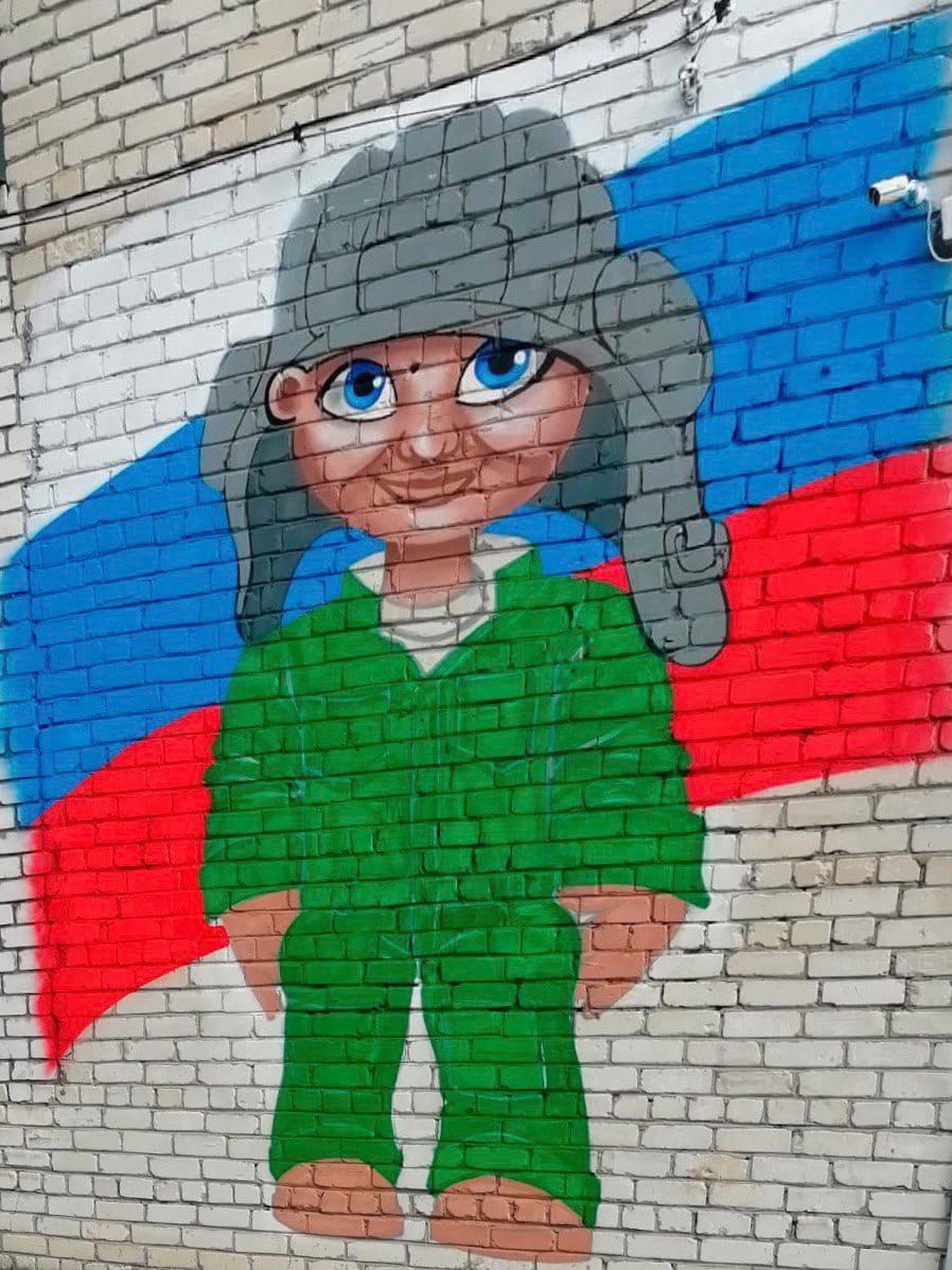 На граффити изображен мальчик Алеша Павличенко – маленький мальчик, который, как сообщают СМИ, ежедневно выбегает на дорогу, чтобы проводить колонны российской военной техники в Белгородской области.