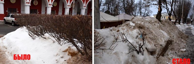 «Юрий Алферов 22 года ухаживает за этими кустами, делал все с душой. А сегодня приехал некто?...на тракторе, и собирая снег, чистя под ярмарку, не убирая его, просто свалил на «кустовую зону» всю массу снега. На попытку сделать ему замечание, что поломаются кусты — послал нашу дежурную и продолжил», — поделилась с подписчиками Комиссарства.