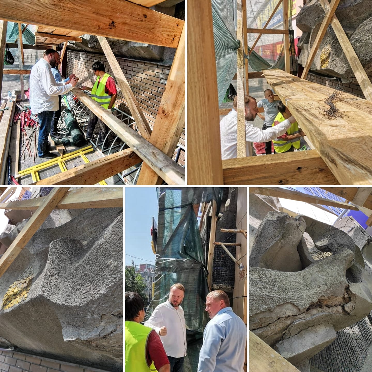 Следующим в очереди – левый барельеф «Математика». По словам главного архитектора, на нем бетон более деформирован. Сама конструкция требует восстановление вплоть до металлического сетчатого каркаса.