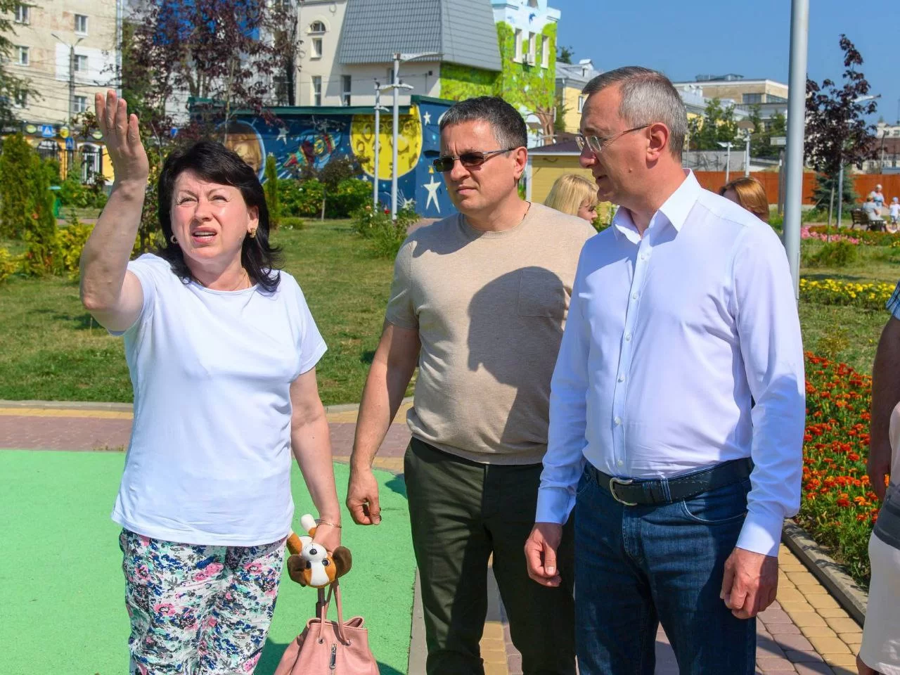 В ту же минуту к гуляющим главам региона и города подошла калужанка, которая попросила придумать что-то от палящего солнца.