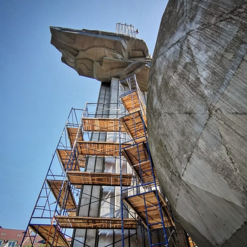 «Также, на объект завезен гранит для облицовки заново оштукатуренного постамента. Идут работы по реставрации рельефа головы К.Э. Циолковского. Аккуратно заделываются каверны и швы в блоках красного гранита из специального состава с мелкими фракциями того же камня и заполировываются. Продолжаются высотные работы по очистке и восстановлению самой стелы», - рассказывает Алексей Комов о ходе работ.