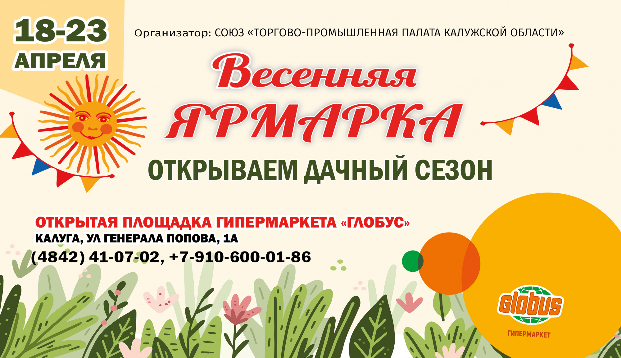 С 18 по 23 апреля 2022 г. на открытой площадке гипермаркета «Глобус» Торгово-промышленная палата Калужской области проводит весеннюю ярмарку «Открываем дачный сезон». Здесь можно будет приобрести саженцы, семена, садовый инструмент, одежду для сельхозработ а также все необходимое для обустройства своего участка. Кроме того, на ярмарке будет проходить торговля фермерскими продуктами.