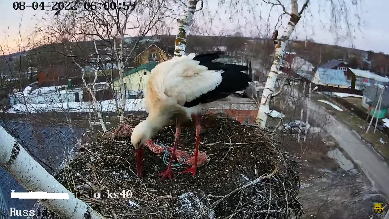 Но вот 6-го числа птица появилась снова и осталась на ночь. Пока в гнезде только одна птица, она ждёт партнёра и потихоньку оставляет свое гнездо и делает его уютным.
