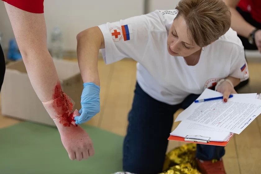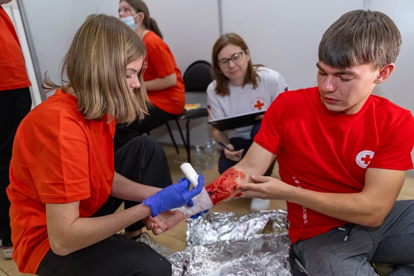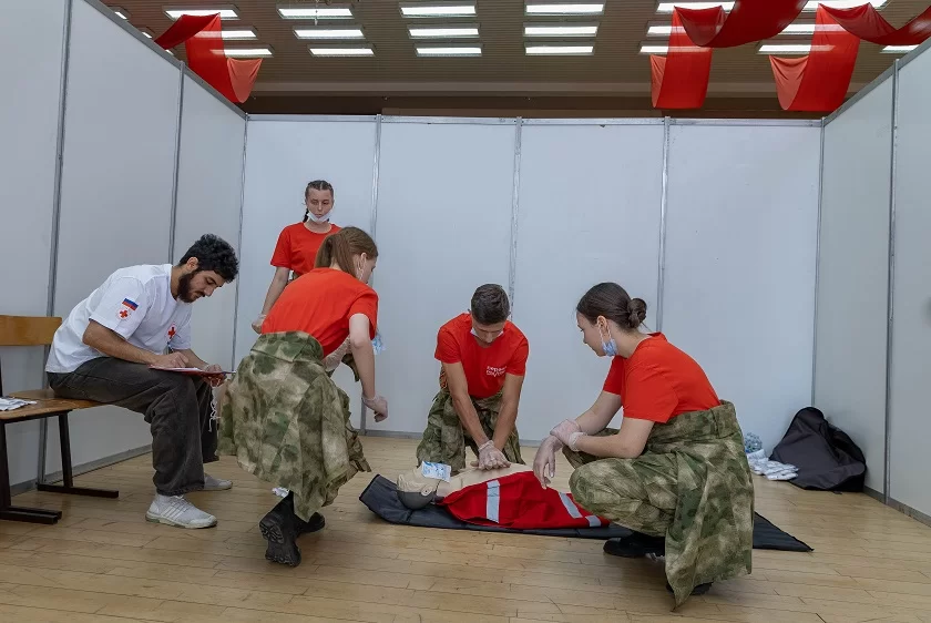 Она поприветствовала участников чемпионата и рассказала, что сегодня им предстоит отработать навыки сердечно-легочной реанимации, показать, как они справляются с кровотечениями, ссадинами, инородными телами в ранах, а также как действуют при потере сознания у человека.