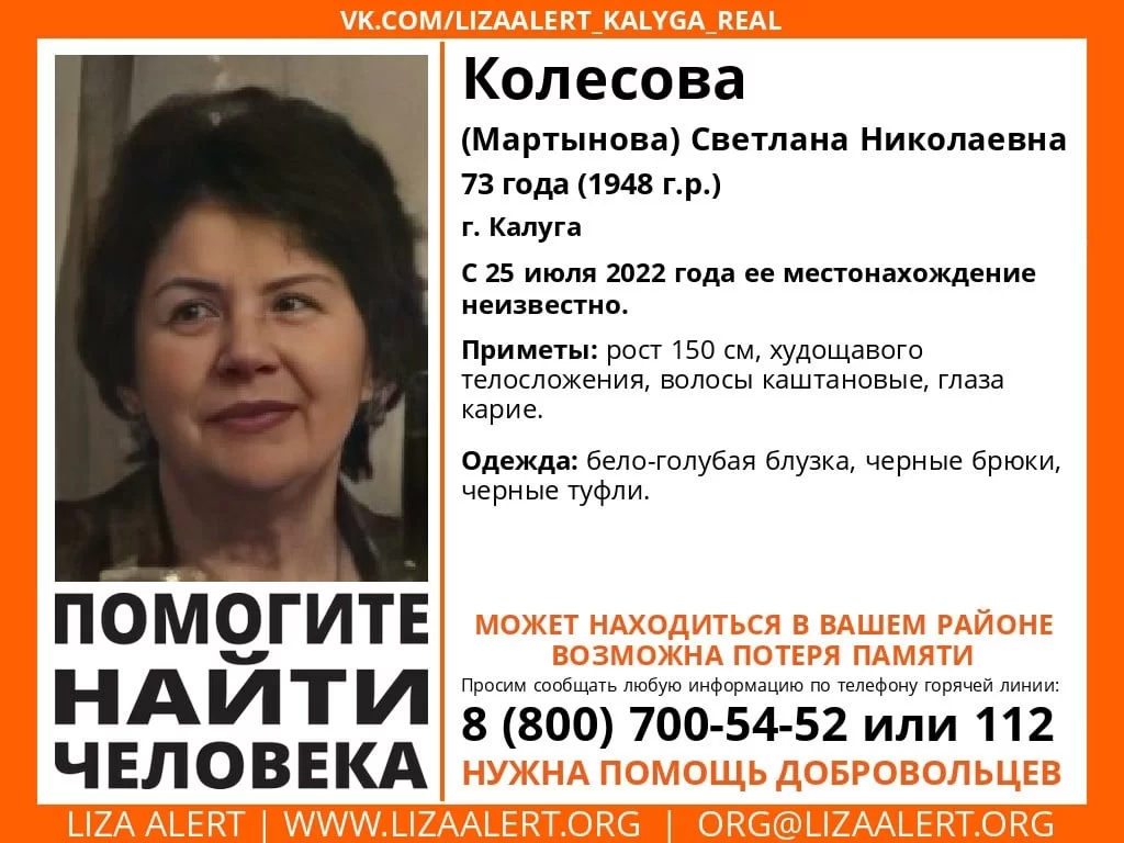 Всех калужан, которые видели Светлану Николаевну или знают о ее местоположении, просят звонить на горячую бесплатную линию поисково-спасательного отряда 8 800 700-54-52.