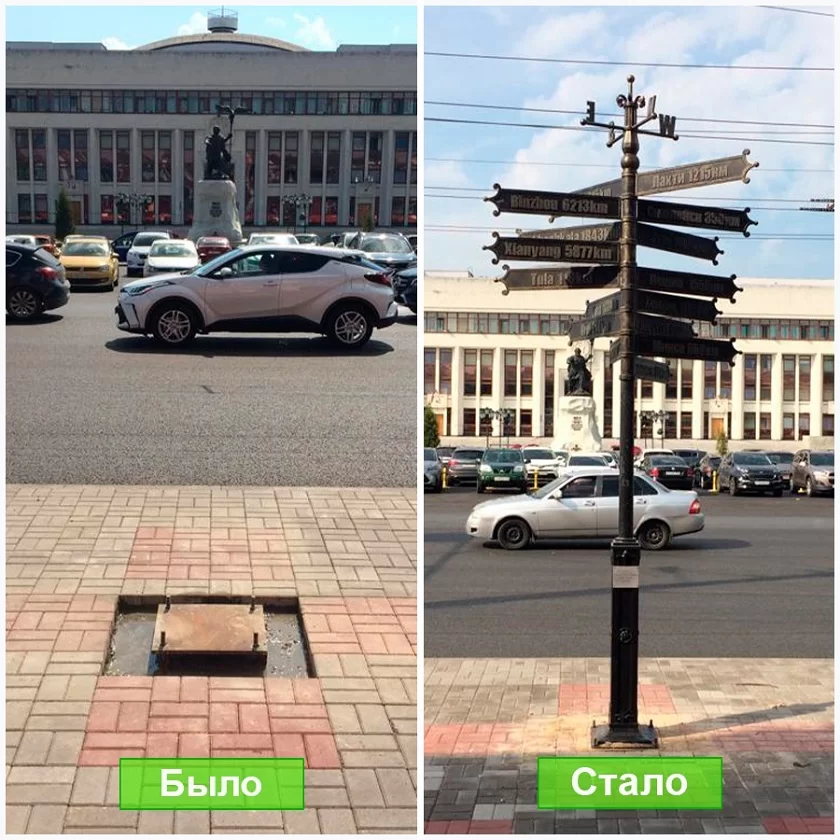 Ранее столб демонтировали для проведения работ по реконструкции тротуара. Теперь у Гостиных рядов жителей и гостей Калуги радует не только новый тротуар, но и столб «со стрелками». А стрелки указывают на такие города-партнёры, как Тула, Смоленск, Орёл, Ялта, китайский Биньчжоу и многие другие. Столб также интересен тем, что на каждом указателе написано расстояние до упомянутого места.
