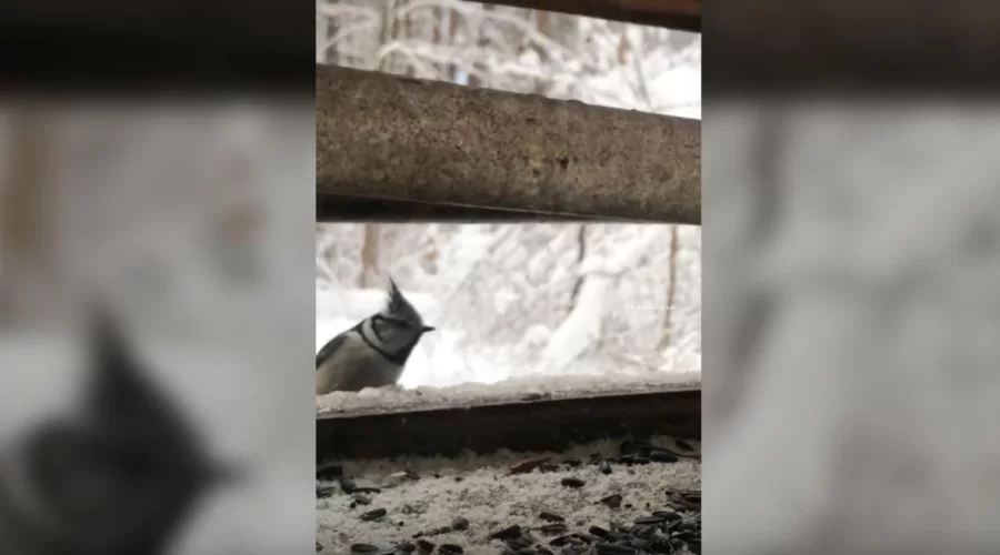 Пернатая «звезда» попала в объектив камеры, которая установлена в Калужском бору. Камера установлена вблизи кормушки, вот и запечатлела редкую птичку, которая решила покушать.