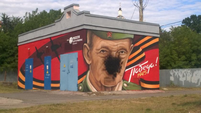 Для создания изображения в Калуге художнику потребовалось 40 килограммов фасадной краски и трое суток. А вандалу хватило одного баллончика краски и несколько минут, чтобы испортить граффити, посвященное Дню Победы.