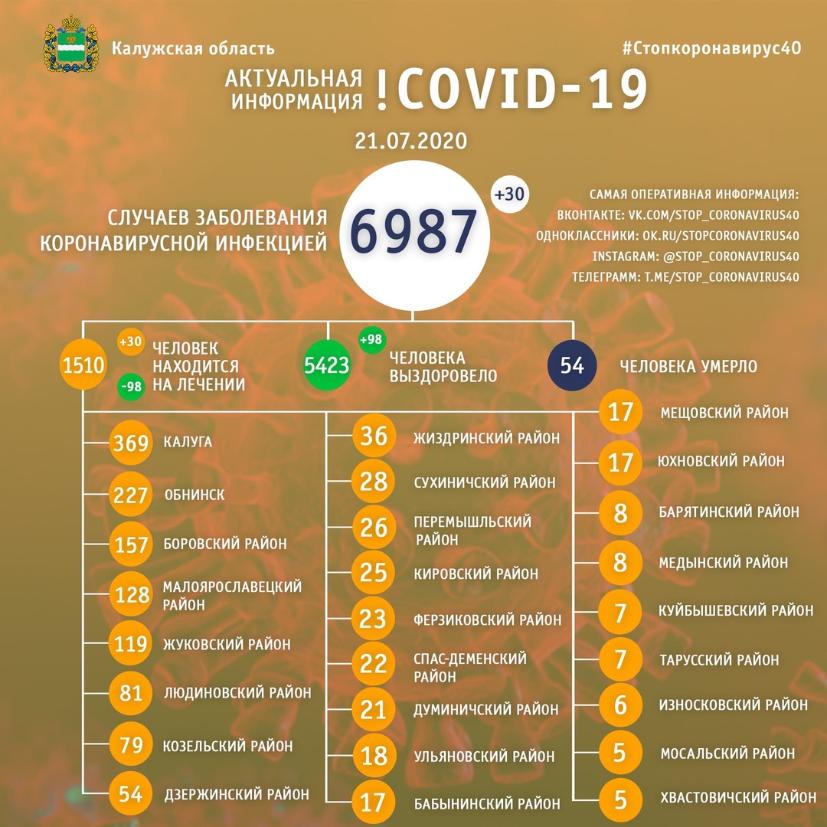 Согласно новой статистике, по состоянию на 21 июля, с начала пандемии в Калужской области зафиксировано 6987 подтверждённых случаев заболевания коронавирусной инфекцией. Из них 30 за последние сутки.