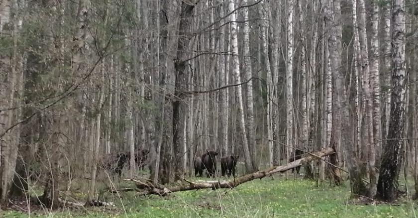 Небольшое стадо зубров с новорожденными малышами удалось запечатлеть на камеру мобильного телефона. На кадрах зубренок только пытается вставать на ноги, по мнению зоологов он родился за несколько часов до записи. Стадо из-за неуклюжего малыша не смогло быстро скрыться в зарослях деревьев.