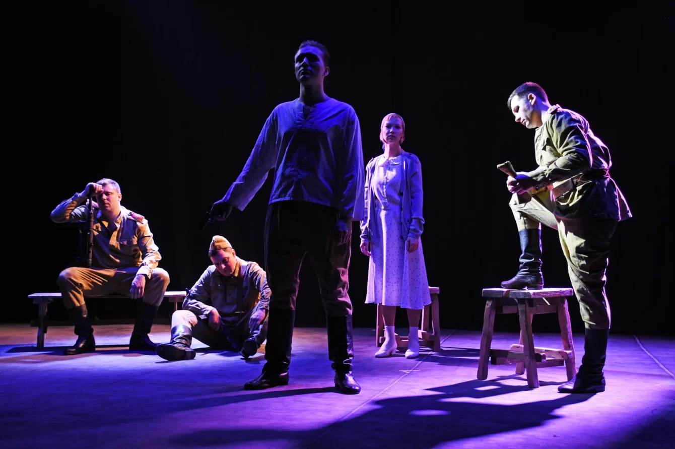 На сцене минимум декораций, только свет, тень и актёры. Пространство оживает благодаря пластике, ритму и внутреннему напряжению.