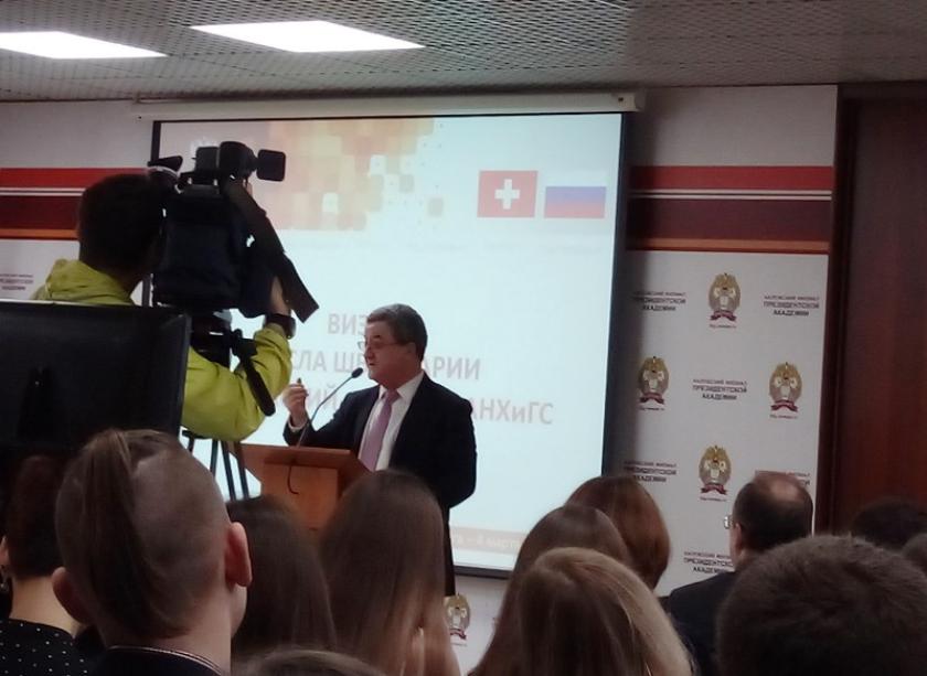 Калужский филиал РАНХиГС при президенте РФ развивает многолетнее сотрудничество со Швейцарской Конфедерацией. Проводятся совместные проекты - международные семинары и научно-практические конференции, круглые столы и лекции, издается научная литература. Например, среди значимых проектов - конференция «Революция 1917 года в России: от международного резонанса к микроистории», семинар «Инновационные технологии и энергетическая эффективность - российские и швейцарские разработки», круглый стол «Знаменитые швейцарские бренды в области государственного управления». Также ежегодно проводятся открытые лекции по вопросам местного самоуправления, проблемам информации и коммуникации в государственном управлении на примере Швейцарии.