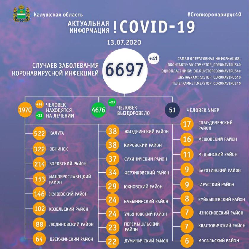 Свежую статистику на 13 июля опубликовал оперативный штаб региона. С начала пандемии в области исследованиями подтверждено 6697 случаев заболевания коронавирусной инфекцией, из них 41 за последние сутки. 70% пациентов выздоровели, сегодня врачи выписали 23 калужан с отрицательными тестами на COVID-19.