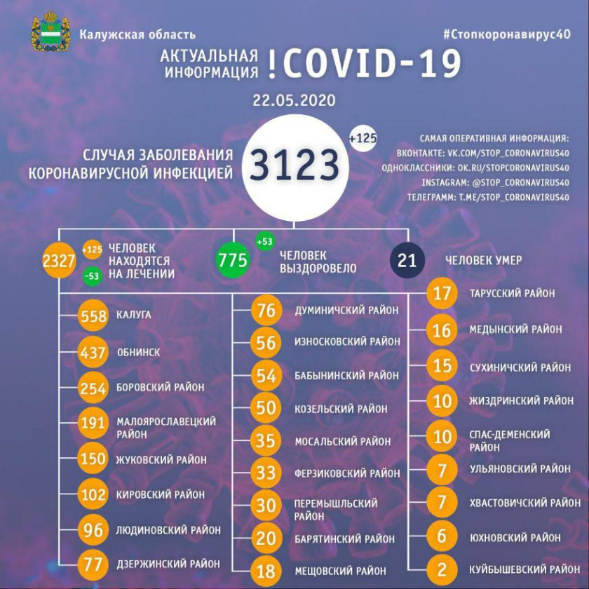 За сутки наличие инфекции подтвердилось еще у 125 калужан, обще число выявленных случаев коронавируса в Калужской области составляет 3123. Большинство из заболевших живут в Калуге, Обнинске, Боровском, Малоярославецком и Жуковском районах.