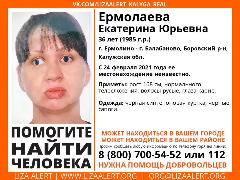 По информации отряда, пропавшую зовут Ермолаева Екатерина Юрьевна. Она проживает в г. Ермолино и в г. Балабаново Боровского района. Местонахождение 36-летней калужанки неизвестно и 24 февраля этого года.