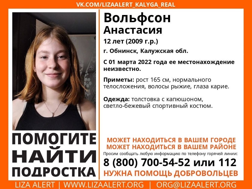 Местонахождение Анастасии Вольфсон неизвестно с 1 марта. Поисковики приводят приметы пропавшей. Рост девочки – 165 см, нормальное телосложение, рыжие волосы, карие глаза. Анастасия была одета в толстовку с капюшоном и светло-бежевый спортивный костюм.