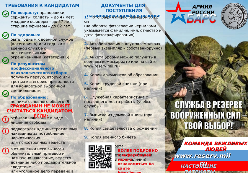 Более подробная информация на сайте https://www.reserv.mil.ru/ или в военном комиссариате по месту воинского учета. Телефон для справок: 8 (4842) 57-00-36.