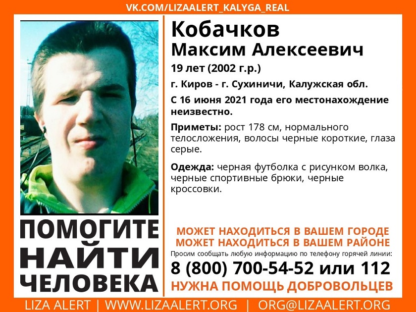 Спасатели просят калужан помочь в поисках Максима Алексеевича Кобачкова. Его местонахождение неизвестно с 16 июня. Рост Максима – 178 см, нормальное телосложение, черные короткие волосы, серые глаза. Пропавший был одет в черную футболку с принтом волка, черные спортивные брюки и черные кроссовки.