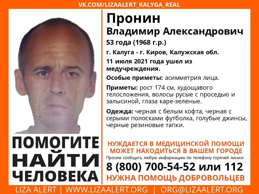 Если вы знаете что-то о местонахождении Владимира Пронина, сообщите об этом на горячую линию отряда по номеру 8-800-700-54-52 или инфоргу Инне по номеру 8-961-123-77-61.