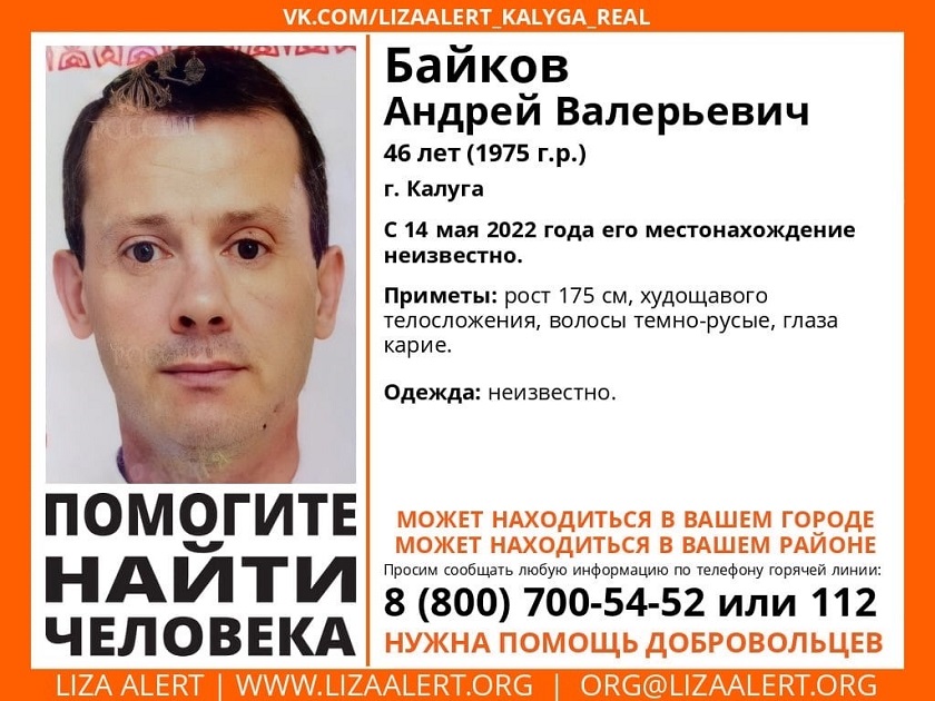 Местонахождение Андрея Байкова с 14 мая этого года неизвестно. Мужчина среднего роста, худощавого телосложения, волосы тёмно-русого цвета, карие глаза. Во что был одет пропавший – неизвестно. Он может находиться в Калуге или области.